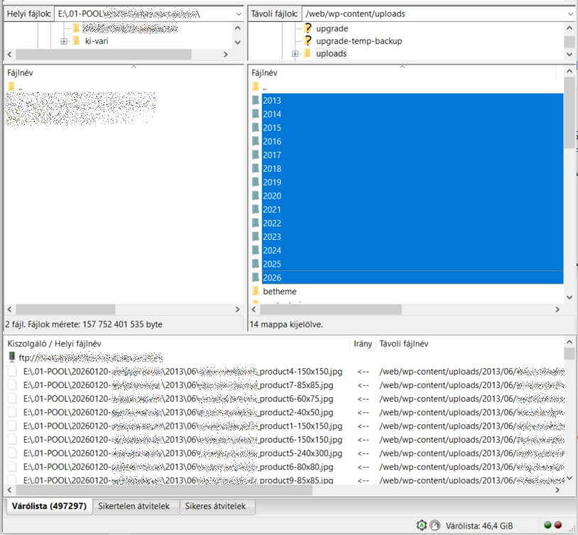 Felmerülhet kérdésként, hogy nem lehetett volna ezt a 2-300 képet is törölni, és ha valamelyik hiányzott volna, akkor a médiatárba egyszerűen visszatölteni? Nem, mert a szerveren év/hó mappában tárolódnak alapesetben a képek, így mondjuk egy 2025. áprilisában feltöltött kép 2026. februári újrafeltöltés eredményeképpen a korábbi wp-content/uploads/2025/04 mappa helyett a wp-content/uploads/2026/02-es mappába kerül, amivel a korábbi elérhetőségre mutató hivatkozások nem állnak helyre.